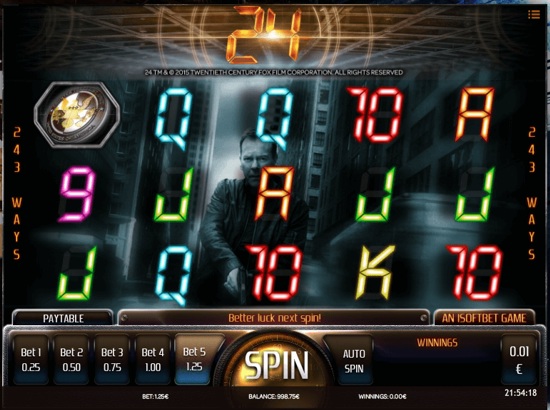 24 is a 243 ways to win slot machine with top payout of 2,250 coins and a bonus round. The online game is presented by iSoftBet.