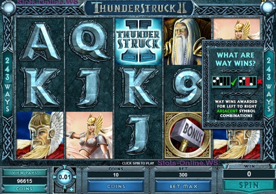 Thunderstruck II slot game has no paylines but offers 43 permanently enabled ways to win (up to 243 ways in bonus rounds), plus Wild Multiplier and 4 free spin style bonus games and Wild Storm bonus..