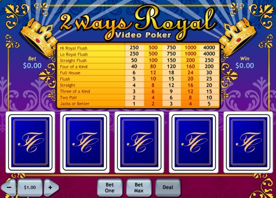 The highest winning hands - Hi Royal Flush and Lo Royal Flush both pays 4,000 coins jackpot if you bet max 5 coins per hand. We recommend you playing the maximum number of coins to get the highest possible odds in this and most the other video poker games developed by Playtech. Play free Flash 2 Ways Royal video poker game now.