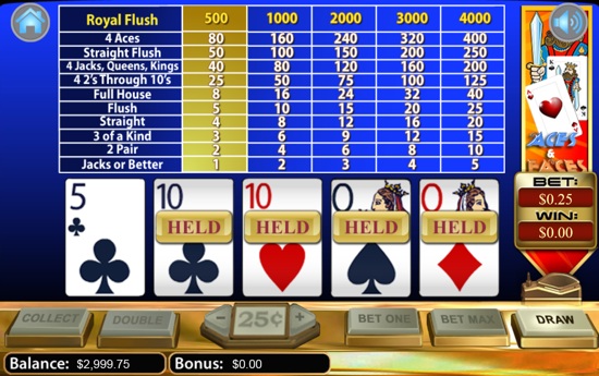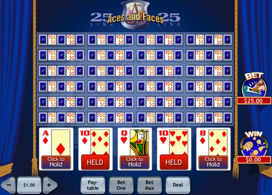 25-Line Aces and Faces is a new Playtech video poker game where you can play 25 hands at a time and test your skill and strategy, and win big. High cards pays well in this game, see payouts table to learn more. Royal Flush wins 4,000 coins jackpot on max bet (5 coins), four Aces wins 800 coins. Play this multi-hand video poker version presented by Casino Tropez now for Free.