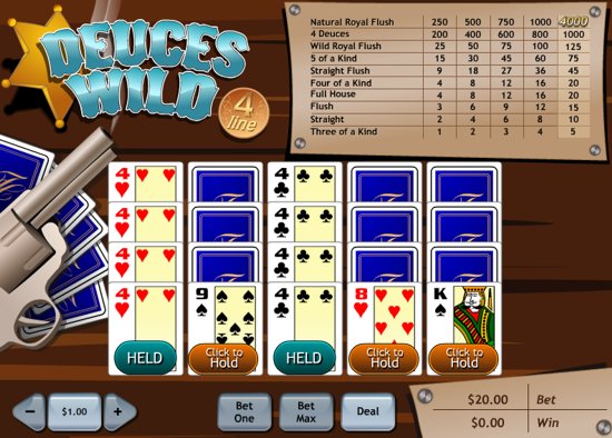 Try out this Deuces Wild video poker version where you can play up to 4 hands at a time. Bet max 5 coins to get the best odds and have a chance to win top regular jackpot of 4,000 coins with Natural Royal Flush. "Four Deuces" pay up to 1,000 bets, "Wild Royal Flush" - 125. There is also "5 of a Kind" winning hand in this video poker game as the deuces are wild! Play free 4-line Deuces Wild now, you'll get $2,000 in chips to start.