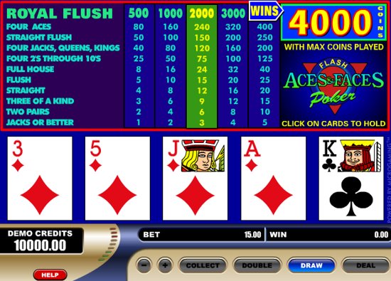 Aces & Faces is a Microgaming video poker game with maximum jackpot of 4,000 coins providing you bet max 5 coins and hit a Royal Flush. High cards are paid well in Aces & Faces video poker. Play this free Flash game from AllSlots casino now.