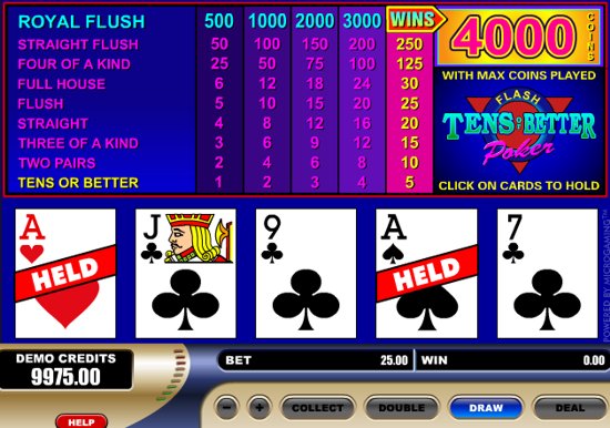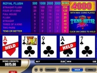 Tens or Better is a video poker version developed by Microgaming and offering top jackpot of 4,000 coins for a Royal Flush if you bet max 5 coins. The game has a total of 9 winning combos with the lowest paying hand to be a Pair of 10's or better. Play this Flash 10's or Better game presented by All Jackpots online casino fo free.