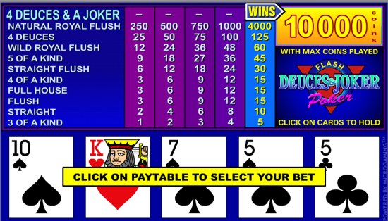 Deuces & Joker is another Microgaming video poker version with one of the largest possible jackpot of 10,000 coins. Just hit 4 Deuces and a Joker to win the top jackpot in this exciting video poker version. 3 of a Kind is the lowest paying combination but you have 11 possible ways (combos) to win in this game. Play free Flash-based Deuces & Joker game from All Slots casino right now. Wild Deuces and Jokers give you the highest possible payout for the cards you are holding in this game.
