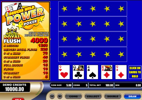 This is a version of Deuces Wild video poker where you can play 5 hands at once. The Deuces are wild in this Power Poker game, so you'll win 1,250 coins by hitting 4 deuces. Hit Natural Royal Flush to win top jackpot of 4,000 coins. Play free multi-hand video poker game presented by Wild Jack casino.