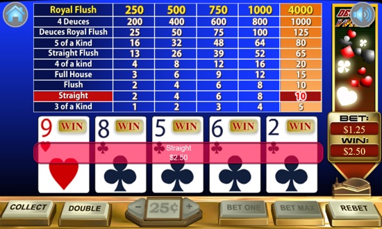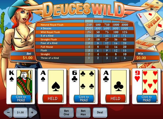 The Deuces pay well in this version of video poker - 4 Deuces pay 1000 coins on max bet, Deuces Royal Flush - 125 coins. The lowest combo is 3 of a kind.