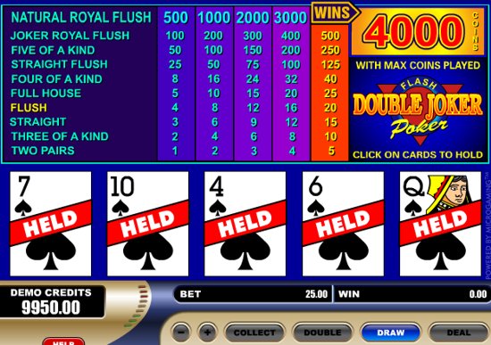 Double Joker is a version video poker game where Joker is Wild card. So that 5 of a Kind and Joker Royal Flush hands pay in this game. Bet maximum 5 coins to have a chance of hitting top jackpot of 4,000 coins in this Free Flash-based Double Joker game. Play at All Jackpots Flash casino that sponsors this free game.