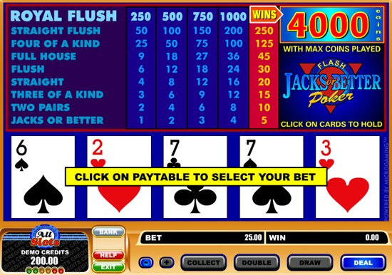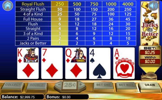 All Slots online casino presents one of the most popular video poker game - Jacks or Better. This is a standard Jacks or Better video poker with no wild cards and max payout of 4,000 coins. Hit at least a Pair of Jacks or better to be paid. Play this free instant game now - no download required.