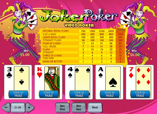 Joker Poker is a popular version of video poker where you should have at least "Kings or Better" to get paid. Joker is Wild in the game, it completes any winning combination. The more coins you insert in the machine the higher odds and payouts you get - top jackpot is 5,000 coins when you bet max 5 coins, but only 750 coins if you bet one. Play Free Joker Poker with bright and funny graphics and real sound.