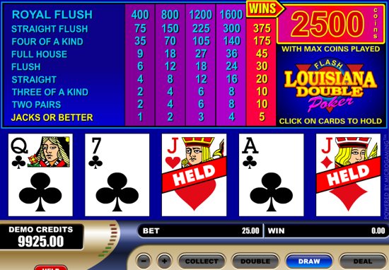 Louisiana Double Poker is a video poker game that is played with a 53-card deck, instead of the normal 52 cards. The extra card is a Double card. If you are holding the Double card with any cards that form a winning combination, the payout of the winning combination is doubled. Play free Flash version of Louisiana Double video poker game from Big Flash online casino (All Jackpots Flash version).